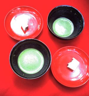 最後のほうにお抹茶屋さんがあって、あわ立てた抹茶と小さな和菓子をいただいて、